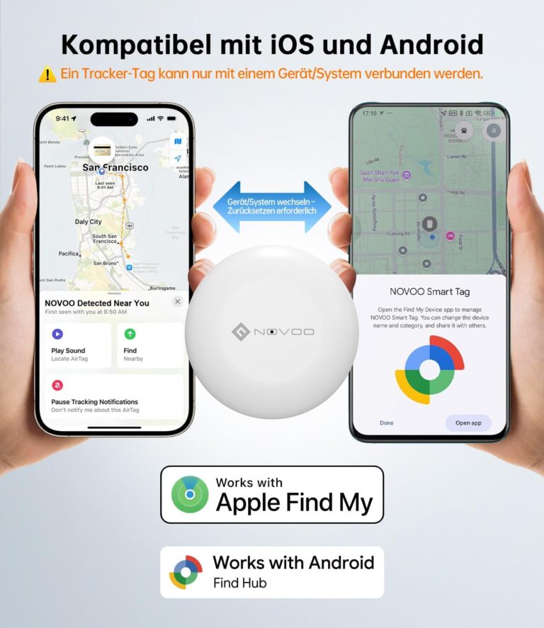 Der Tracker ist mit so gut wie jedem Smartphone kompatibel, das das entsprechende Tracking-Netzwerk unterstützt. Der NOVOO Air Tag Schlüsselfinder Smart Tracker und ähnliche Dual-System-Varianten von NOVOO sind so konzipiert, dass sie mit beiden großen Smartphone-Plattformen funktionieren: Apple iOS und Android. Dazu zählen die Netzwerke Apple „Find My“ für iPhones und iPads sowie Google „Find My Device“ bzw. ähnliche Android-Tracking-Funktionen