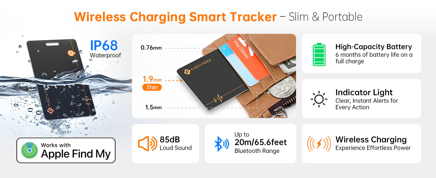 Langjährige Batterielaufzeit von bis zu etwa 1 Jahr ohne Aufladen (je nach Modell), oder – bei speziellen Air-Tag-Karten-Trackern sogar mehrere Jahre Laufzeit ohne Akkuwechsel.
